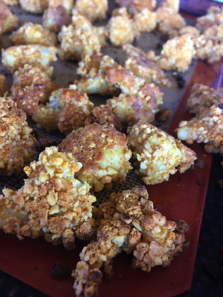 You don’t want the cashews to be too big or they won’t stick to the cauliflower.