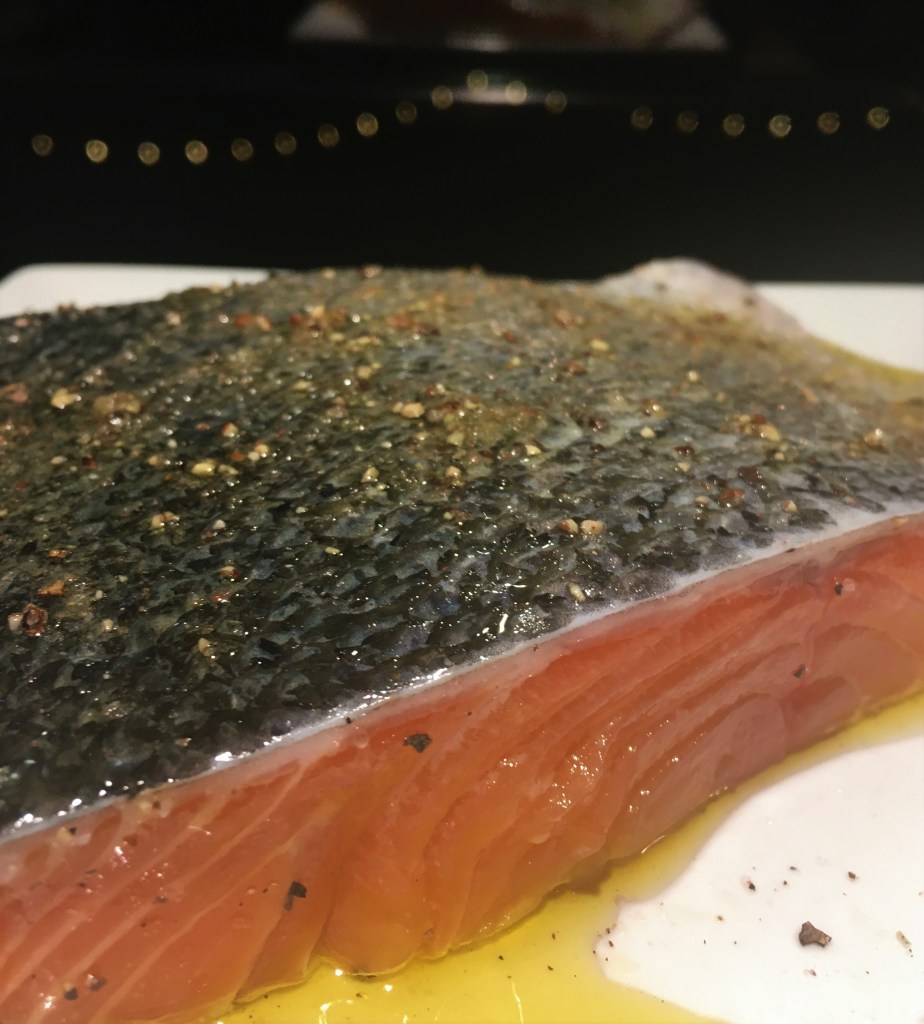 - Get a pan nice and hot – no oil needed it’s already on the fish.