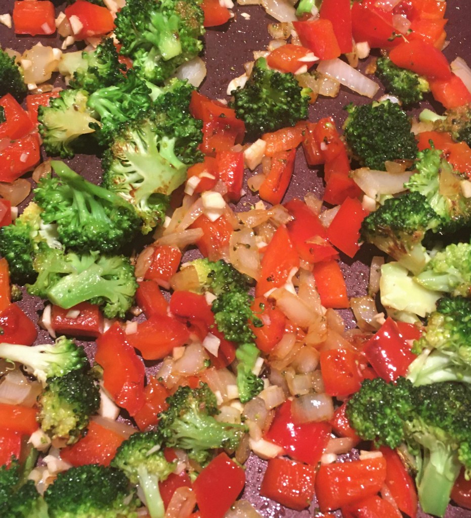 ADD broccoli, red pepper and onion, sprinkle generously with salt