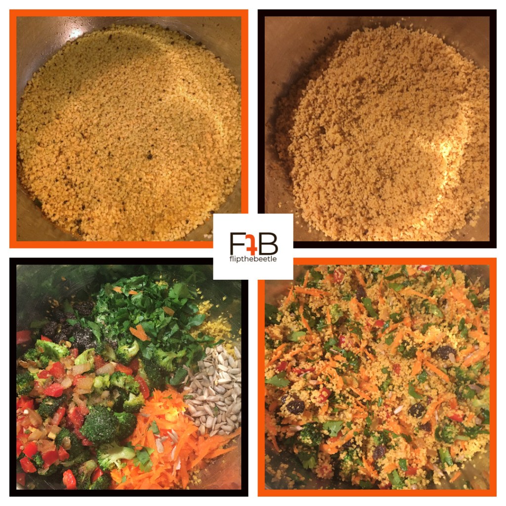 Place couscous in large bowl (metal or glass) MIX in dry spices.