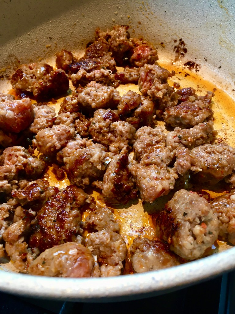 CLEAR the pan of all the oil from the sausages with a paper towel but leave any crispy bits, your just sopping up the grease.