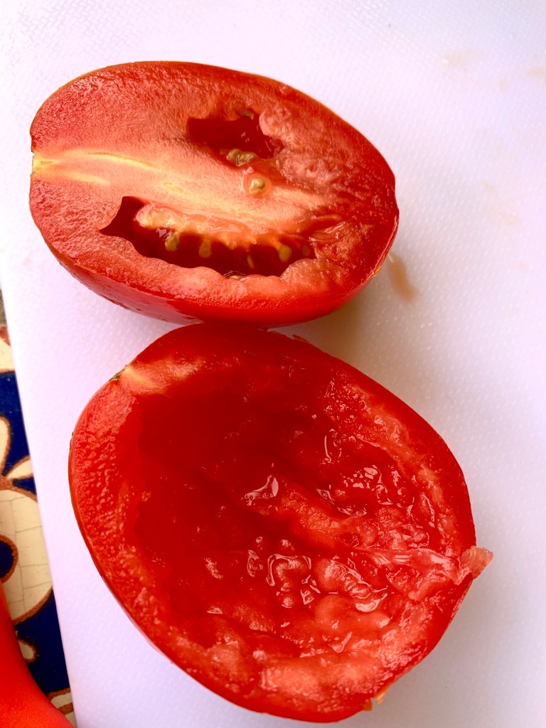 Slice the tomato in half, use a spoon to scrape out the seeds.