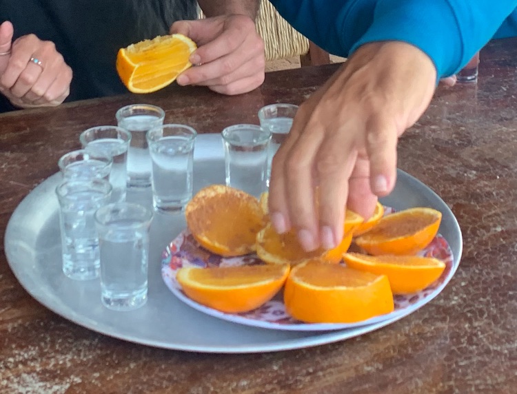 Tequila Shots with a side of fresh sliced oranges sprinkled with cinnamon.