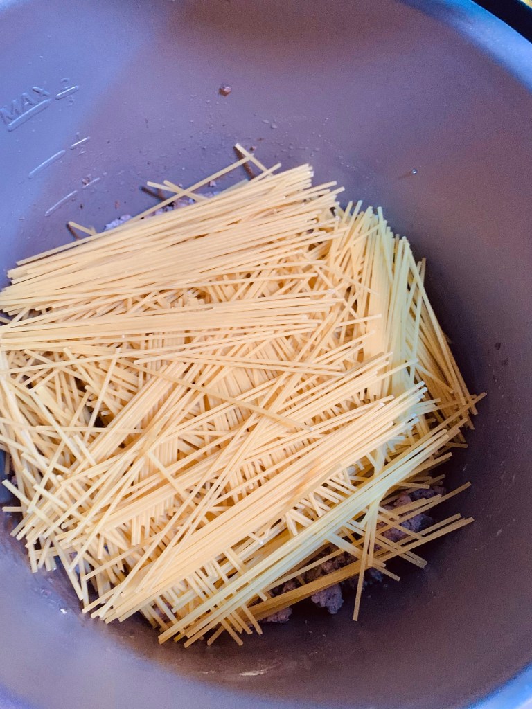 BREAK 1 lb of spaghetti in half placing in a criss cross pattern into the Instant pot.